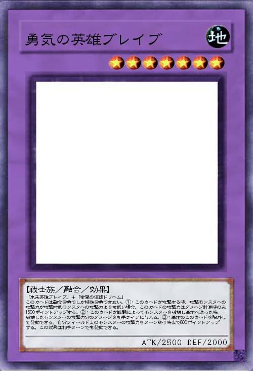 | 「未来英雄ブレイブ」+「希望の使徒ドリーム」 このカードは融合召喚でしか特殊召喚できない。①:このカードが攻撃する時、攻撃モンスターの攻撃力が攻撃対象モンスターの攻撃力よりも低い場合、このカードの攻撃力はダメージ計算時のみ1500ポイントアップする。②:このカードが戦闘によってモンスターを破壊し墓地へ送った時、破壊したモンスターの攻撃力分のダメージを相手ライフに与える。③:墓地のこのカードを除外して発動できる。自分フィールド上のモンスターの攻撃力をターン終了時まで800ポイントアップする。この効果は相手ターンでも発動できる。 | |||