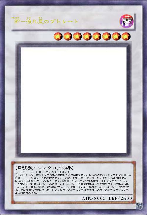 | 「BF」チューナー+「BF」モンスター1体以上 ①このモンスターがシンクロ召喚に成功したとき発動できる。自分の墓地のシンクロモンスター以外の「BF」モンスター1体を除外する。その後、除外したモンスターの元々のレベルの数値分、自分のデッキからカードをドローする。②1ターンに1度自分の墓地の「BF」シンクロモンスター1体とシンクロモンスター以外の「BF」モンスター1体を対象にして発動できる。対象にした「BF」シンクロモンスターを特殊召喚し、シンクロモンスター以外の「BF」モンスターを除外する。その後特殊召喚した「BF」シンクロモンスターのレベルを除外したモンスターの元々のレベルの数値分あげる。 | |||