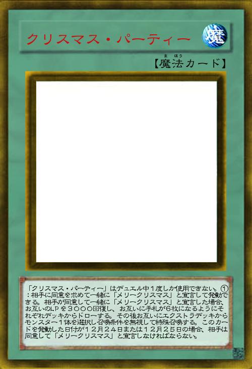 | 「クリスマス・パーティー」はデュエル中1度しか使用できない。①:相手に同意を求めて一緒に「メリークリスマス」と宣言して発動できる。相手が同意して一緒に「メリークリスマス」と宣言した場合、お互いのLPを3000回復し、お互いに手札が6枚になるようにそれぞれデッキからドローする。その後お互いにエクストラデッキからモンスター1体を選択し召喚条件を無視して特殊召喚する。このカードを発動した日付が12月24日または12月25日の場合、相手は同意して「メリークリスマス」と宣言しなければならない。 | |||