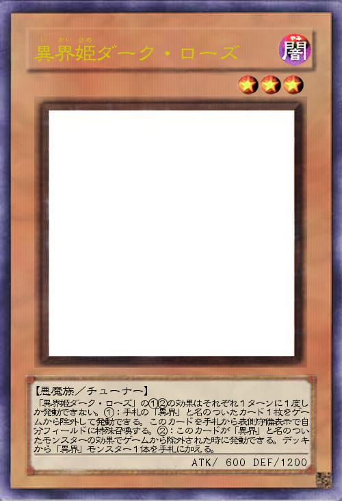 | 「異界姫ダーク・ローズ」の①②の効果はそれぞれ1ターンに1度しか発動できない。①:手札の「異界」と名のついたカード1枚をゲームから除外して発動できる。このカードを手札から表側守備表示で自分フィールドに特殊召喚する。②:このカードが「異界」と名のついたモンスターの効果でゲームから除外された時に発動できる。デッキから「異界」モンスター1体を手札に加える。 | |||