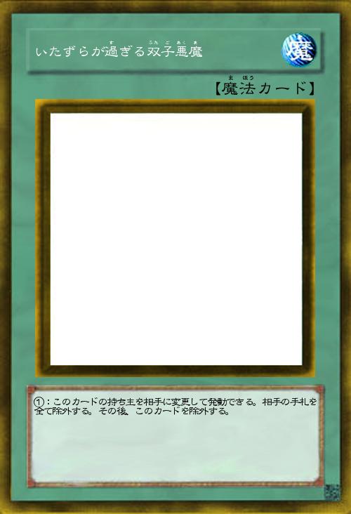 | ①:このカードの持ち主を相手に変更して発動できる。相手の手札を全て除外する。その後、このカードを除外する。 | |||
