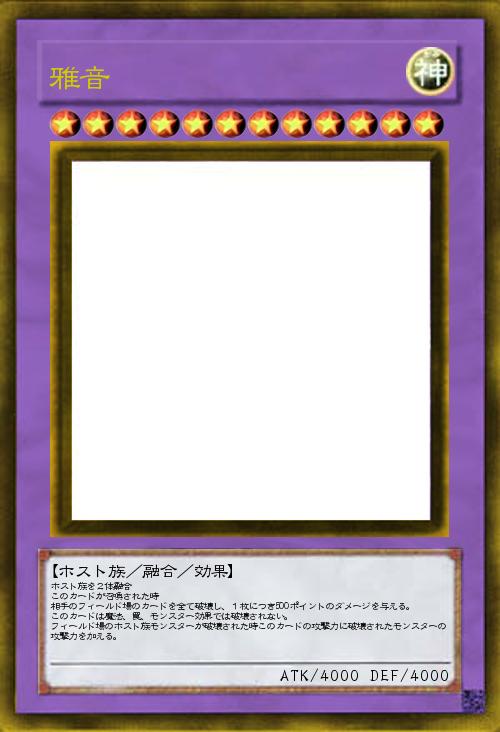 | ホスト族を2体融合 このカードが召喚された時 相手のフィールド場のカードを全て破壊し、1枚につき500ポイントのダメージを与える。 このカードは魔法、罠、モンスター効果では破壊されない。 フィールド場のホスト族モンスターが破壊された時このカードの攻撃力に破壊されたモンスターの攻撃力を加える。 | |||