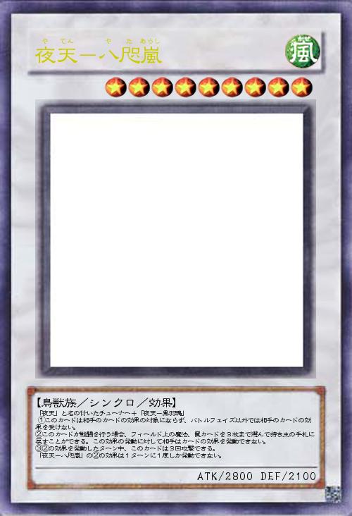 | 「夜天」と名の付いたチューナー+「夜天-黒羽鴉」 ①このカードは相手のカードの効果の対象にならず、バトルフェイズ以外では相手のカードの効果を受けない。 ②このカードが戦闘を行う場合、フィールド上の魔法、罠カードを3枚まで選んで持ち主の手札に戻すことができる。この効果の発動に対して相手はカードの効果を発動できない。 ③②の効果を発動したターン中、このカードは3回攻撃できる。 「夜天-八咫嵐」の②の効果は1ターンに1度しか発動できない。 | |||