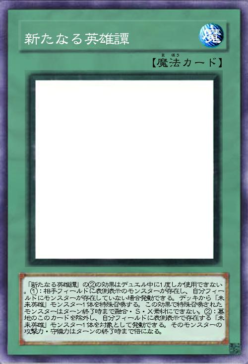 | 「新たなる英雄譚」の②の効果はデュエル中に1度しか使用できない。①:相手フィールドに表側表示のモンスターが存在し、自分フィールドにモンスターが存在していない場合発動できる。デッキから「未来英雄」モンスター1体を特殊召喚する。この効果で特殊召喚されたモンスターはターン終了時まで融合・S・X素材にできない。②:墓地のこのカードを除外し、自分フィールドに表側表示で存在する「未来英雄」モンスター1体を対象として発動できる。そのモンスターの攻撃力・守備力はターンの終了時まで倍になる。 | |||