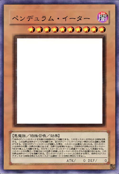 | ①相手のPゾーンのカードを任意の枚数除外して発動できる。このモンスターを手札から特殊召喚する。この効果は相手ターンでも発動でき、自分のPゾーンにカードがない場合にのみ発動と処理ができる。②自分のPゾーンにカードが発動した場合、このカードは墓地へ送られる。③このカードは相手の攻撃・効果の対象にならず、効果では破壊されない。④相手のP召喚されたモンスター1体を対象として発動できる。そのモンスターをこのカードに装備カード扱いとして装備させる。このカードの攻撃力・守備力はこの効果で装備したモンスターのそれぞれの数値の倍になる。この効果は相手ターンでも発動できる。⑤このカードがフィールド上に存在する限り、相手のエクストラデッキから特殊召喚されたモンスターは融合・S・X召喚の素材にできない。 | |||