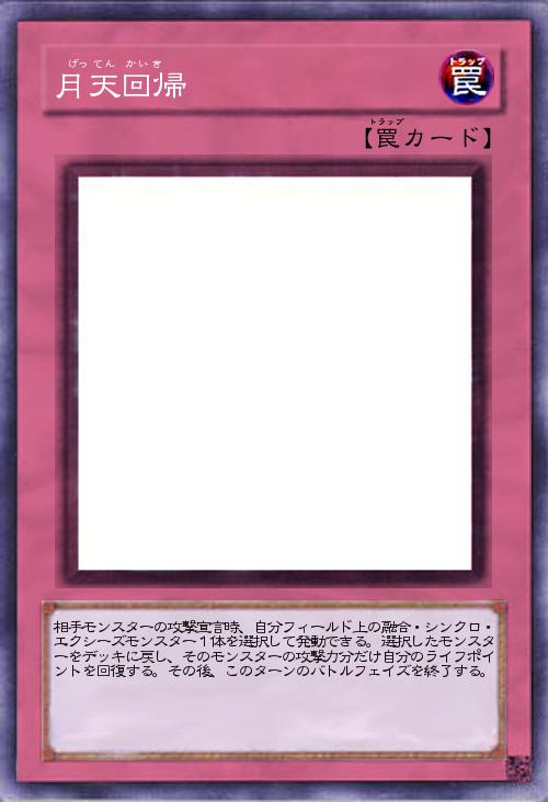 | 相手モンスターの攻撃宣言時、自分フィールド上の融合・シンクロ・エクシーズモンスター1体を選択して発動できる。選択したモンスターをデッキに戻し、そのモンスターの攻撃力分だけ自分のライフポイントを回復する。その後、このターンのバトルフェイズを終了する。 | |||
