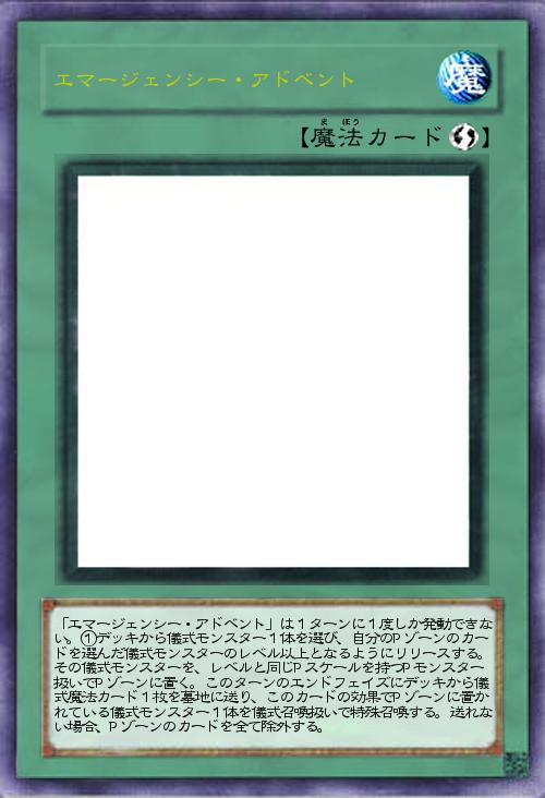 | 「エマージェンシー・アドベント」は1ターンに1度しか発動できない。①デッキから儀式モンスター1体を選び、自分のPゾーンのカードを選んだ儀式モンスターのレベル以上となるようにリリースする。その儀式モンスターを、レベルと同じPスケールを持つPモンスター扱いでPゾーンに置く。このターンのエンドフェイズにデッキから儀式魔法カード1枚を墓地に送り、このカードの効果でPゾーンに置かれている儀式モンスター1体を儀式召喚扱いで特殊召喚する。送れない場合、Pゾーンのカードを全て除外する。 | |||