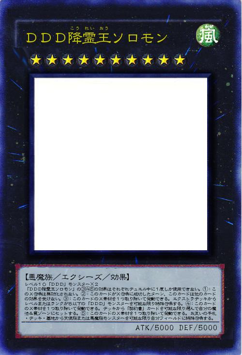 | レベル10「DDD」モンスター×2 「DDD降霊王ソロモン」の③④⑤の効果はそれぞれデュエル中に1度しか使用できない。①:このX召喚は無効化されない。②:このカードがX召喚に成功したターン、このカードは他のカードの効果を受けない。③:このカードのX素材を1つ取り除いて発動できる。エクストラデッキからレベルまたはランクが8以下の「DDD」モンスターを可能な限り特殊召喚する。④:このカードのX素材を1つ取り除いて発動できる。デッキから「契約書」カードを可能な限り選んで自分の魔法&罠ゾーンにセットする。⑤:このカードのX素材を1つ取り除いて発動できる。お互いの手札・デッキ・墓地から天使族または悪魔族モンスターを可能な限り自分フィールドに特殊召喚する。 | |||