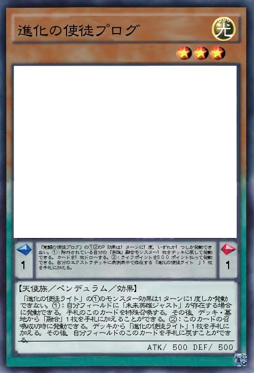 | 「覚醒の使徒プログ」の①②のP効果は1ターンに1度、いずれか1つしか発動できない。①:除外されている自分の「英雄」融合モンスター1枚をデッキに戻して発動できる。カードを1枚ドローする。②:ライフポイントを500ポイント払って発動できる。自分のエクストラデッキに表側表示で存在する「進化の使徒ライト 」1枚を手札に加える。 | |||