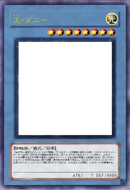 | 「血を吸い過ぎたダニー」により降臨。①:このカードの降臨に成功した時、このカードのコントローラーは100-1000までの整数を宣言する。②:1から10まであるルーレットを回し、このカードの攻撃力は①の効果で宣言した数にルーレットで出た数を累乗した数値になる。③:このカードはライフを4000払わない限り攻撃・表示形式を変更できない。④このカードのコントローラーは自分のスタンバイフェイズ毎に500ライフを払う。払えなかった場合、このカードを破壊する。 | |||
