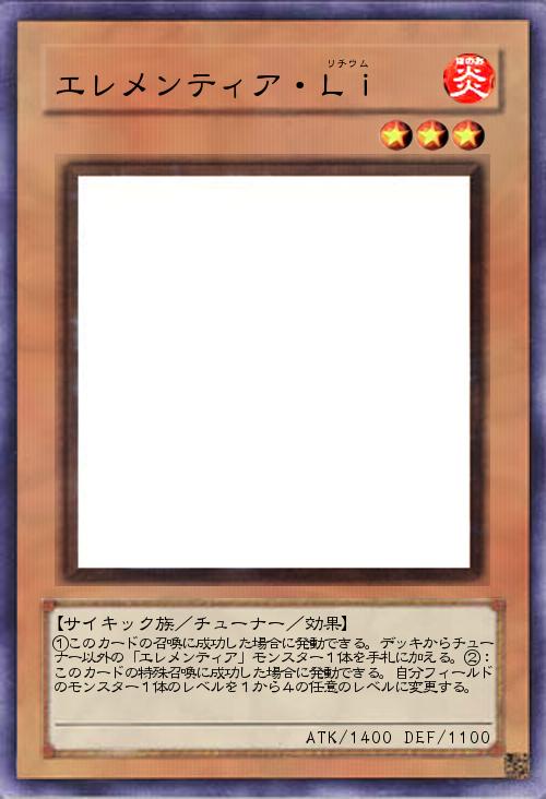 「エレメンティアの3体目、チューナー以外のサーチができるエレメンティアです。レベルが若干めんどくさそうなのでレベル変更効果も。反応性のやたら高いらしいリチウムな効果です。」(2016-01-01 23:04)