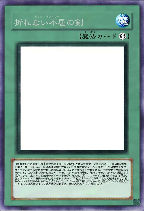 | 「折れない不屈の剣」の①の効果は1ターンに1度しか使用できず、またこのカードの発動に対して魔法・罠・モンスターの効果は発動できない。①:相手がフィールドのカードを破壊する魔法・罠・モンスターの効果を発動した時に2000LPを支払って発動できる。その発動を無効にして除外する。この効果で除外したカードがモンスターだった場合、除外したモンスターの攻撃力か守備力のうち、高い方の数値分のダメージを相手に与える。②:このカードが墓地に存在する限り、自分フィールドの装備カードはそれぞれ1ターンに1度だけカードの効果によって破壊されず、相手のカードの効果の対象にもならない。③:このカードが墓地に送られて(自分のターンで数えて)3ターン後の自分ターン終了時に発動する。墓地のこのカードを除外する。 | |||