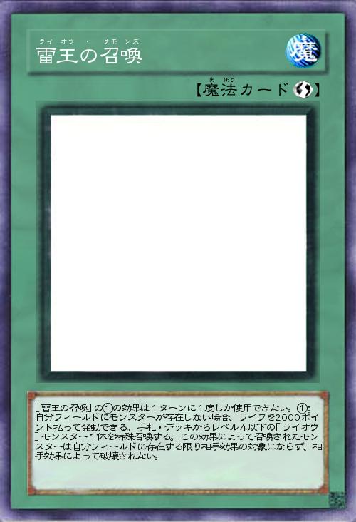 | [雷王の召喚]の①の効果は1ターンに1度しか使用できない。①:自分フィールドにモンスターが存在しない場合、ライフを2000ポイント払って発動できる。手札・デッキからレベル4以下の[ライオウ]モンスター1体を特殊召喚する。この効果によって召喚されたモンスターは自分フィールドに存在する限り相手効果の対象にならず、相手効果によって破壊されない。 | |||