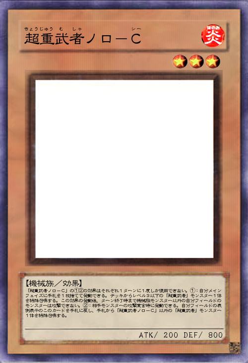 | 「超重武者ノロ-C」の①②の効果はそれぞれ1ターンに1度しか使用できない。①:自分メインフェイズに手札を1枚捨てて発動できる。デッキからレベル3以下の「超重武者」モンスター1体を特殊召喚する。この効果の発動後、ターン終了時まで機械族モンスター以外の自分フィールドのモンスターは攻撃できない。②:相手モンスターの攻撃宣言時に発動できる。自分フィールドの表側表示のこのカードを手札に戻し、手札から「超重武者ノロ-C」以外の「超重武者」モンスター1体を特殊召喚する。 | |||