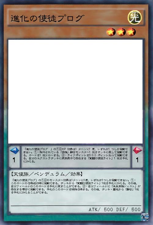 | 「進化の使徒プログ」の①②のモンスター効果は1ターンに1度、いずれか1つしか発動できない。①:このカードの召喚成功時に発動できる。デッキから「覚醒の使徒ライト」1枚を手札に加える。その後、自分フィールドのこのカードを手札に戻すことができる。②:自分フィールドに「未来英雄ジャスト」が存在する場合に発動できる。手札のこのカードを特殊召喚する。その後、デッキ・墓地から「融合」1枚を手札に加えることができる。 | |||