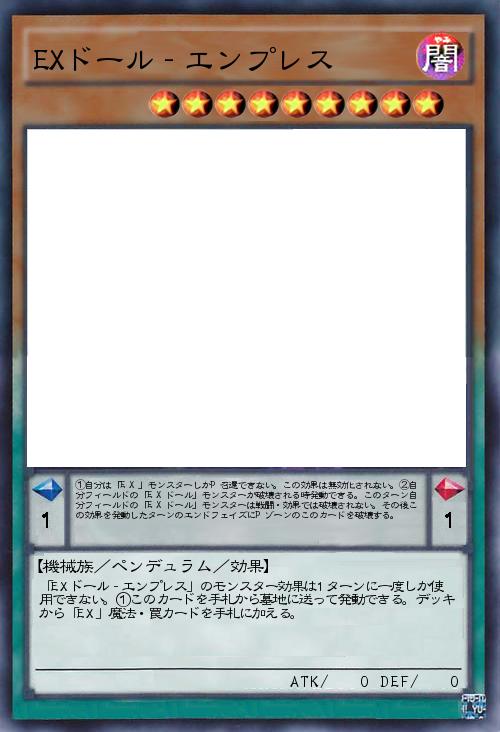 | 「EXドール‐エンプレス」のモンスター効果は1ターンに一度しか使用できない。①このカードを手札から墓地に送って発動できる。デッキから「EX」魔法・罠カードを手札に加える。 | |||