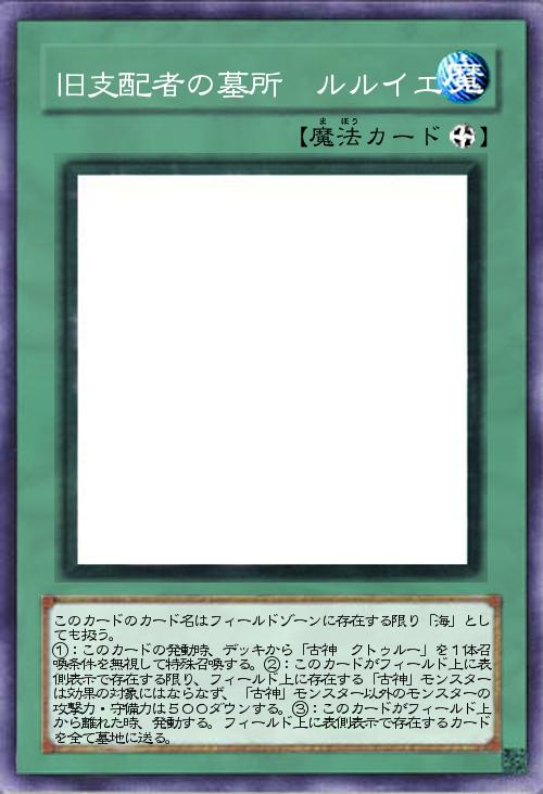 | このカードのカード名はフィールドゾーンに存在する限り「海」としても扱う。 ①:このカードの発動時、デッキから「古神 クトゥルー」を1体召喚条件を無視して特殊召喚する。②:このカードがフィールド上に表側表示で存在する限り、フィールド上に存在する「古神」モンスターは効果の対象にはならなず、「古神」モンスター以外のモンスターの攻撃力・守備力は500ダウンする。③:このカードがフィールド上から離れた時、発動する。フィールド上に表側表示で存在するカードを全て墓地に送る。 | |||