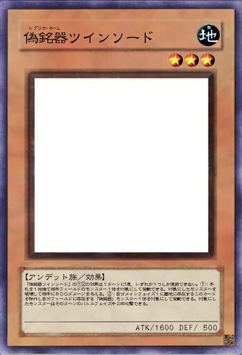 | 「偽銘器ツインソード」の①②の効果は1ターンに1度、いずれか1つしか使用できない。①:手札を1枚捨て相手フィールドのモンスター1体を対象にして発動できる。対象にしたモンスターを破壊して相手に500ダメージを与える。②:自分メインフェイズ1に墓地に存在するこのカードを除外し自分フィールドに存在する「偽銘器」モンスター1体を対象にして発動できる。対象にしたモンスターはそのターンのバトルフェイズ中2回攻撃できる。 | |||