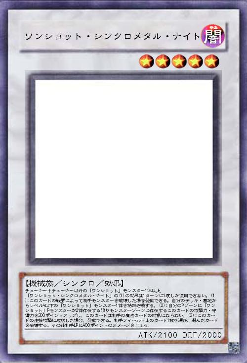 | チューナー+チューナー以外の「ワンショット」モンスター1体以上 「ワンショット・シンクロメタル・ナイト」の(1)の効果は1ターンに1度しか使用できない。(1):このカードの戦闘によって相手モンスターを破壊した場合発動できる。自分のデッキ・墓地からレベル4以下の「ワンショット」モンスター1体を特殊召喚する。(2):自分のPゾーンに「ワンショット」Pモンスターが2体存在する限りモンスターゾーンに存在するこのカードの攻撃力・守備力を300ポイントアップし、このカードは相手の魔法カードの対象にならない。(3):このカードの直接攻撃に成功した場合、発動できる。相手フィールド上のカード1枚を選び、選んだカードを破壊する。その後相手LPに400ポイントのダメージを与える。 | |||