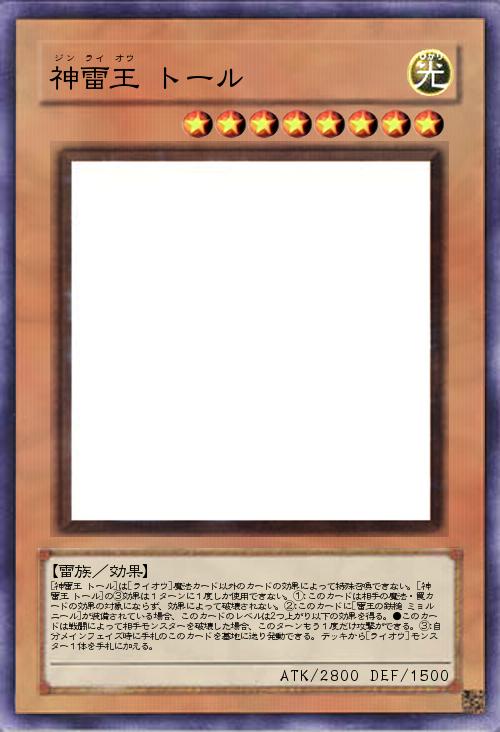 | [神雷王 トール]は[ライオウ]魔法カード以外のカードの効果によって特殊召喚できない。[神雷王 トール]の③効果は1ターンに1度しか使用できない。①:このカードは相手の魔法・罠カードの効果の対象にならず、効果によって破壊されない。②:このカードに[雷王の鉄槌 ミョルニール]が装備されている場合、このカードのレベルは2つ上がり以下の効果を得る。●このカードは戦闘によって相手モンスターを破壊した場合、このターンもう1度だけ攻撃ができる。③:自分メインフェイズ時に手札のこのカードを墓地に送り発動できる。デッキから[ライオウ]モンスター1体を手札に加える。 | |||