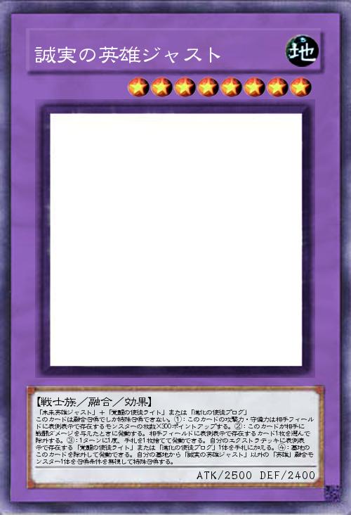 | 「未来英雄ジャスト」+「覚醒の使徒ライト」または「進化の使徒プログ」 このカードは融合召喚でしか特殊召喚できない。①:このカードの攻撃力・守備力は相手フィールドに表側表示で存在するモンスターの枚数×300ポイントアップする。②:このカードが相手に戦闘ダメージを与えたときに発動する。相手フィールドに表側表示で存在するカード1枚を選んで除外する。③:1ターンに1度、手札を1枚捨てて発動できる。自分のエクストラデッキに表側表示で存在する「覚醒の使徒ライト」または「進化の使徒プログ」1体を手札に加える。④:墓地のこのカードを除外して発動できる。自分の墓地から「誠実の英雄ジャスト」以外の「英雄」融合モンスター1体を召喚条件を無視して特殊召喚する。 | |||