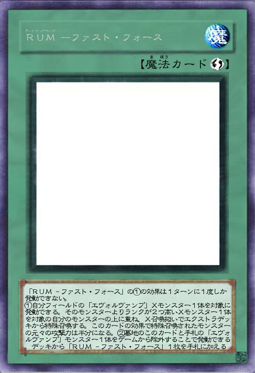 | 「RUM -ファスト・フォース」の①の効果は1ターンに1度しか発動できない。 ①自分フィールドの「エヴォルヴァンプ」Xモンスター1体を対象に発動できる。そのモンスターよりランクが2つ高いXモンスター1体を対象の自分のモンスターの上に重ね、X召喚扱いでエクストラデッキから特殊召喚する。このカードの効果で特殊召喚されたモンスターの元々の攻撃力は半分になる。②墓地のこのカードと手札の「エヴォルヴァンプ」モンスター1体をゲームから除外することで発動できる。デッキから「RUM -ファスト・フォース」1枚を手札に加える。 | |||