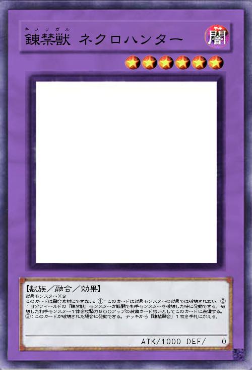 ネクロハンターは効果モンスター3体を素材とする融合モンスターで、自身を含めた錬禁獣モンスターが相手モンスターを戦闘破壊すると装備して攻撃力をアップさせます。