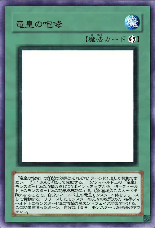 | 「竜皇の咆哮」の①②の効果はそれぞれ1ターンに1度しか発動できない。 ①:1000LP払って発動する。自分フィールド上の「竜皇」モンスター1体の攻撃力を1000ポイントアップさせ、相手フィールド上のモンスター1体の効果を無効にする。②:墓地のこのカードを除外することで、自分フィールド上の竜皇モンスター1体をリリースして発動する。リリースしたモンスターの元々の攻撃力分、相手フィールド上のモンスター1体の攻撃力をエンドフェイズ時まで下げる。この効果を使ったターン、自分は「竜皇」モンスターしか特殊召喚できない。 | |||