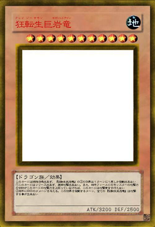 | このカードは特殊召喚出来ず、『狂転生巨岩竜』の②の効果は1ターンに1度しか発動出来ない ①このカードはリリース出来ず、直接攻撃出来ない。また、相手フィールドのモンスターの攻撃力の合計がこのカードの攻撃力を上回っていなければ、このカードは攻撃宣言を行えない ②相手に3000のダメージを与える。この効果を発動するターン、全ての『狂転生巨岩竜』は攻撃する事が出来ない | |||
