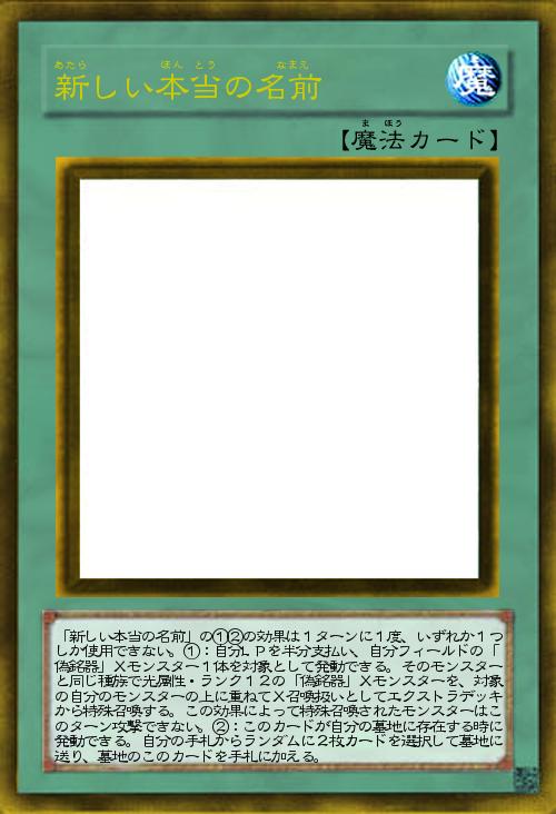 | 「新しい本当の名前」の①②の効果は1ターンに1度、いずれか1つしか使用できない。①:自分LPを半分支払い、自分フィールドの「偽銘器」Xモンスター1体を対象として発動できる。そのモンスターと同じ種族で光属性・ランク12の「偽銘器」Xモンスターを、対象の自分のモンスターの上に重ねてX召喚扱いとしてエクストラデッキから特殊召喚する。この効果によって特殊召喚されたモンスターはこのターン攻撃できない。②:このカードが自分の墓地に存在する時に発動できる。自分の手札からランダムに2枚カードを選択して墓地に送り、墓地のこのカードを手札に加える。 | |||