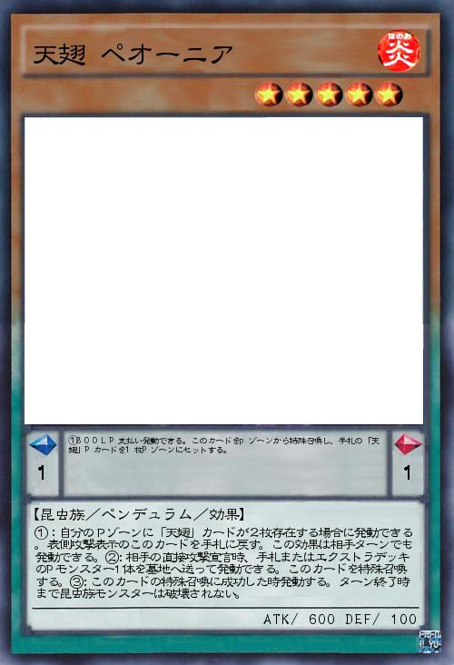 | ①800LP支払い発動できる。このカードをpゾーンから特殊召喚し、手札の「天翅」Pカードを1枚Pゾーンにセットする。 | |||