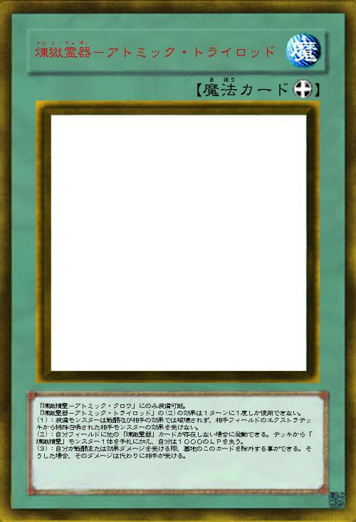 | 「煉獄精霊-アトミック・クロウ」にのみ装備可能。 「煉獄霊器-アトミック・トライロッド」の(2)の効果は1ターンに1度しか使用できない。 (1):装備モンスターは戦闘及び相手の効果では破壊されず、相手フィールドのエクストラデッキから特殊召喚された相手モンスターの効果を受けない。 (2):自分フィールドに他の「煉獄霊器」カードが存在しない場合に発動できる。デッキから「煉獄精霊」モンスター1体を手札に加え、自分は1000のLPを失う。 (3):自分が戦闘または効果ダメージを受ける際、墓地のこのカードを除外する事ができる。そうした場合、そのダメージは代わりに相手が受ける。 | |||