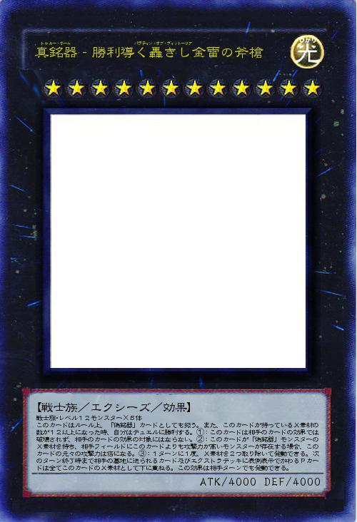 | 戦士族・レベル12モンスター×5体 このカードはルール上、「偽銘器」カードとしても扱う。また、このカードが持っているX素材の数が12以上になった時、自分はデュエルに勝利する。①:このカードは相手のカードの効果では破壊されず、相手のカードの効果の対象にはならない。②:このカードが「偽銘器」モンスターのX素材を持ち、相手フィールドにこのカードよりも攻撃力が高いモンスターが存在する場合、このカードの元々の攻撃力は倍になる。③:1ターンに1度、X素材を2つ取り除いて発動できる。次のターン終了時まで相手の墓地に送られるカード及びエクストラデッキに表側表示で加わるPカードは全てこのカードのX素材として下に重ねる。この効果は相手ターンでも発動できる。 | |||
