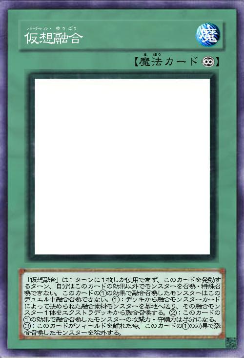 | 「仮想融合」は1ターンに1枚しか使用できず、このカードを発動するターン、自分はこのカードの効果以外でモンスターを召喚・特殊召喚できない。このカードの①の効果で融合召喚したモンスターはこのデュエル中融合召喚できない。①:デッキから融合モンスターカードによって決められた融合素材モンスターを墓地へ送り、その融合モンスター1体をエクストラデッキから融合召喚する。②:このカードの①の効果で融合召喚したモンスターの攻撃力・守備力は半分になる。③:このカードがフィールドを離れた時、このカードの①の効果で融合召喚したモンスターを除外する。 | |||