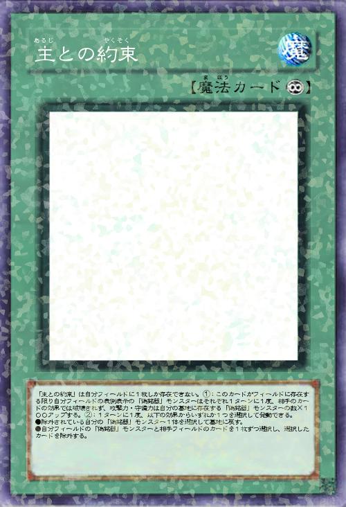| 「主との約束」は自分フィールドに1枚しか存在できない。①:このカードがフィールドに存在する限り自分フィールドの表側表示の「偽銘器」モンスターはそれぞれ1ターンに1度、相手のカードの効果では破壊されず、攻撃力・守備力は自分の墓地に存在する「偽銘器」モンスターの数×100アップする。②:1ターンに1度、以下の効果からいずれか1つを選択して発動できる。 ●除外されている自分の「偽銘器」モンスター1体を選択して墓地に戻す。 ●自分フィールドの「偽銘器」モンスターと相手フィールドのカードを1枚ずつ選択し、選択したカードを除外する。 | |||