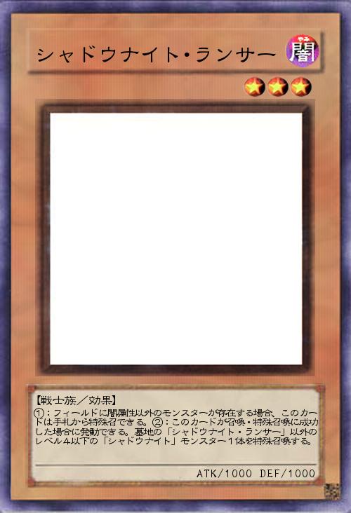 | ①:フィールドに闇属性以外のモンスターが存在する場合、このカードは手札から特殊召できる。②:このカードが召喚・特殊召喚に成功した場合に発動できる。墓地の「シャドウナイト・ランサー」以外のレベル4以下の「シャドウナイト」モンスター1体を特殊召喚する。 | |||