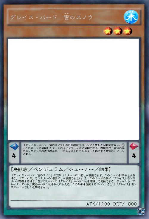 | 「グレイス・バード 雪のスノウ」の効果は1ターンに1度しか使用できず、このカードをS素材とする場合、「グレイス」モンスターのS召喚にしか使用できない。①:このカードの隣に「グレイス」モンスターが存在する場合、自分のPゾーンの「グレイス」カード1枚を破壊して発動できる。デッキから「グレイス・アート」魔法カード1枚を手札に加える。この効果を発動するターン、自分は「グレイス」モンスター1体でしか攻撃できない。 | |||
