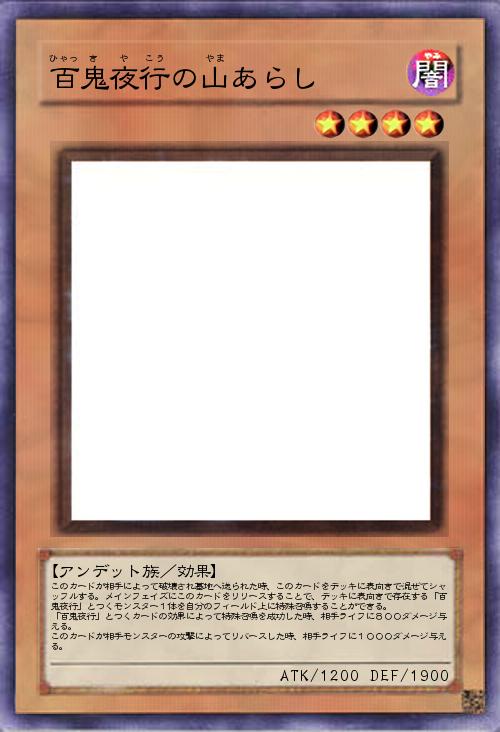 | このカードが相手によって破壊され墓地へ送られた時、このカードをデッキに表向きで混ぜてシャッフルする。メインフェイズにこのカードをリリースすることで、デッキに表向きで存在する「百鬼夜行」とつくモンスター1体を自分のフィールド上に特殊召喚することができる。 「百鬼夜行」とつくカードの効果によって特殊召喚を成功した時、相手ライフに800ダメージ与える。 このカードが相手モンスターの攻撃によってリバースした時、相手ライフに1000ダメージ与える。 | |||