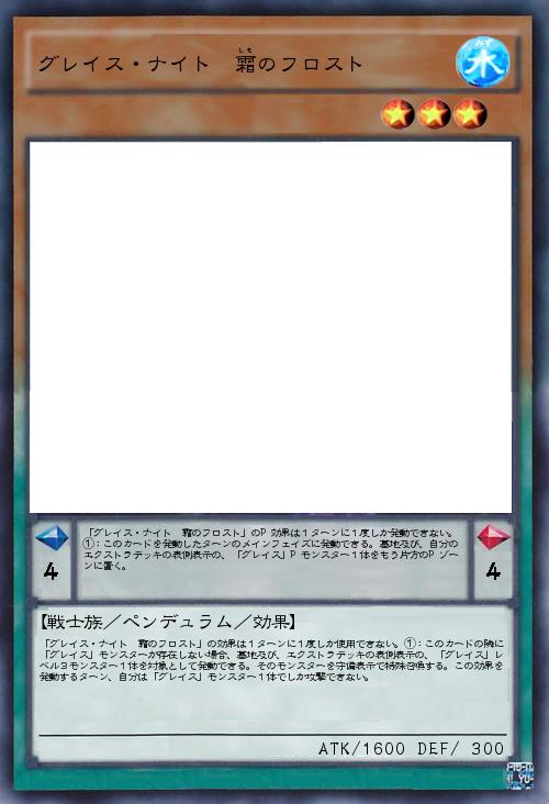 | 「グレイス・ナイト 霜のフロスト」のP効果は1ターンに1度しか発動できない。①:このカードを発動したターンのメインフェイズに発動できる。墓地及び、自分のエクストラデッキの表側表示の、「グレイス」Pモンスター1体をもう片方のPゾーンに置く。 | |||