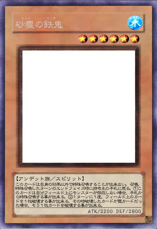 砂塵の安全な敵カード除去用のカードです!相手カードがなくても出せるのが強み!鉄鬼出す。→狂鬼出す。→鉄鬼で二枚割る。→面出す。→面リリースして斬月鬼出す。鉄鬼破壊して狂鬼二回攻撃。
