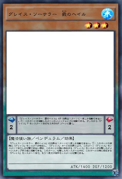 | 「グレイス・ソーサラー 霰のヘイル」のP効果は1ターンに1度しか発動できない。①:このカードを発動したターンのメインフェイズに発動できる。デッキから「グレイス」Pモンスター1体をもう片方のPゾーンに置く。 | |||