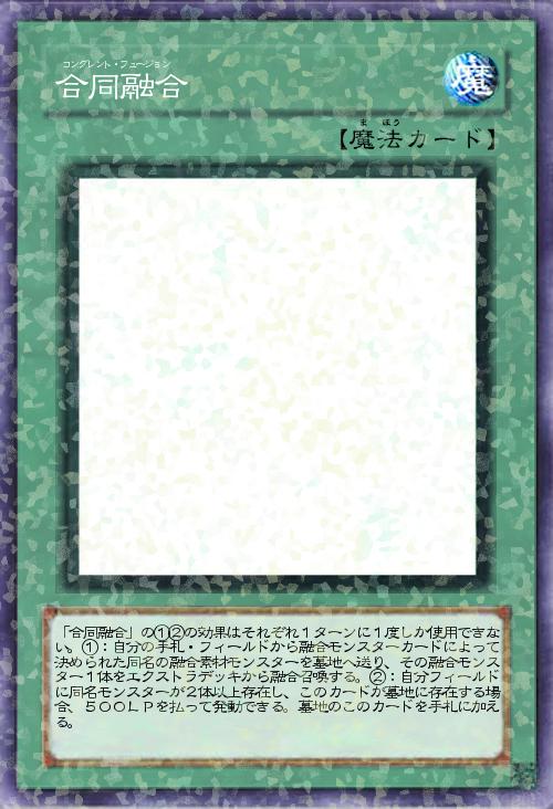 | 「合同融合」の①②の効果はそれぞれ1ターンに1度しか使用できない。①:自分の手札・フィールドから融合モンスターカードによって決められた同名の融合素材モンスターを墓地へ送り、その融合モンスター1体をエクストラデッキから融合召喚する。②:自分フィールドに同名モンスターが2体以上存在し、このカードが墓地に存在する場合、500LPを払って発動できる。墓地のこのカードを手札に加える。 | |||