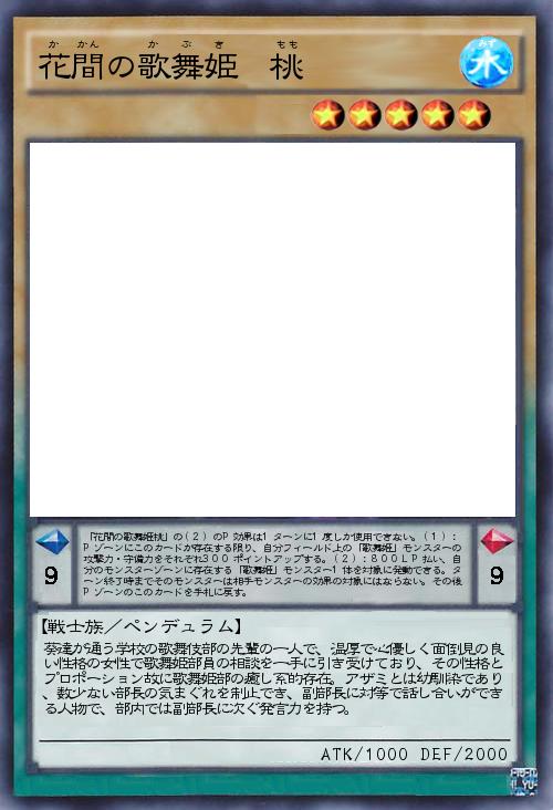 ステータスはレベル5通常モンスターとはいえ、P効果が比較的優秀だったため、その分ステータスを下げて調整したつもりです。まぁ、歌舞姫カードだけでも茜や集家紋等ステータスアップカードが多い為、案外このステータスの方が丁度良いかもしれません。