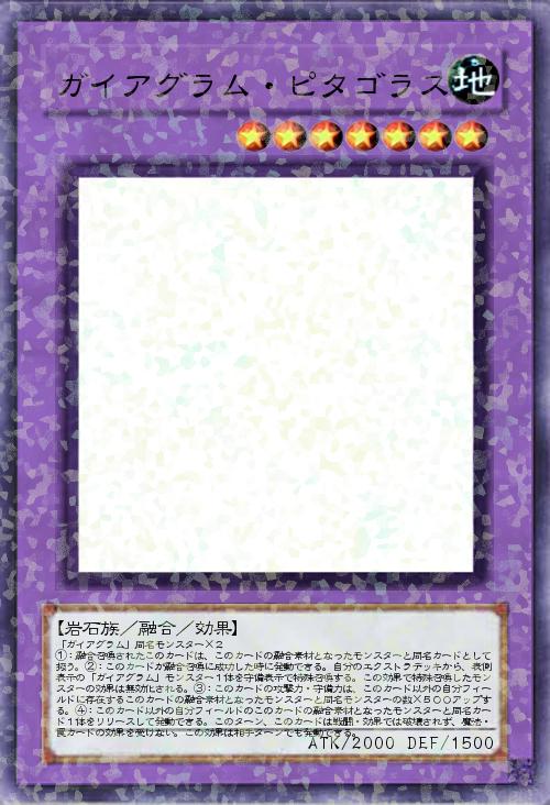 | 「ガイアグラム」同名モンスター×2 ①:融合召喚されたこのカードは、このカードの融合素材となったモンスターと同名カードとして扱う。②:このカードが融合召喚に成功した時に発動できる。自分のエクストラデッキから、表側表示の「ガイアグラム」モンスター1体を守備表示で特殊召喚する。この効果で特殊召喚したモンスターの効果は無効化される。③:このカードの攻撃力・守備力は、このカード以外の自分フィールドに存在するこのカードの融合素材となったモンスターと同名モンスターの数×500アップする。④:このカード以外の自分フィールドのこのカードの融合素材となったモンスターと同名カード1体をリリースして発動できる。このターン、このカードは戦闘・効果では破壊されず、魔法・罠カードの効果を受けない。この効果は相手ターンでも発動できる。 | |||