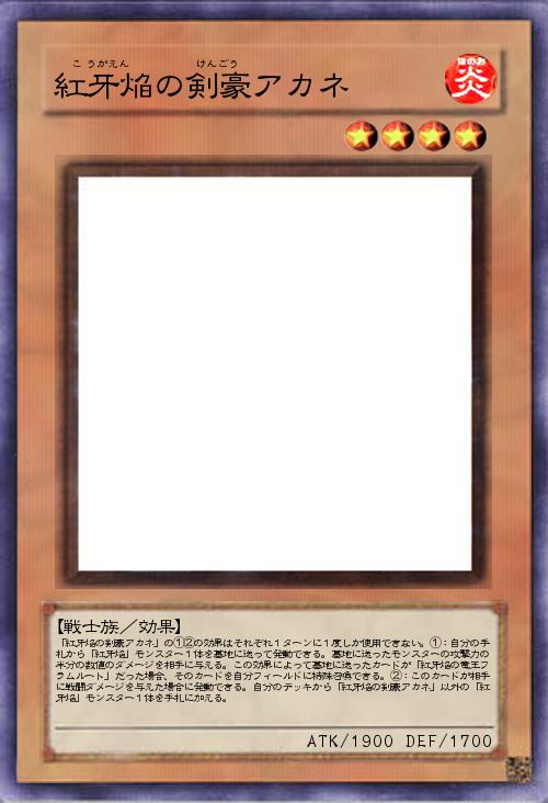 | 「紅牙焔の剣豪アカネ」の①②の効果はそれぞれ1ターンに1度しか使用できない。①:自分の手札から「紅牙焔」モンスター1体を墓地に送って発動できる。墓地に送ったモンスターの攻撃力の半分の数値のダメージを相手に与える。この効果によって墓地に送ったカードが「紅牙焔の竜王フラムルート」だった場合、そのカードを自分フィールドに特殊召喚できる。②:このカードが相手に戦闘ダメージを与えた場合に発動できる。自分のデッキから「紅牙焔の剣豪アカネ」以外の「紅牙焔」モンスター1体を手札に加える。 | |||
