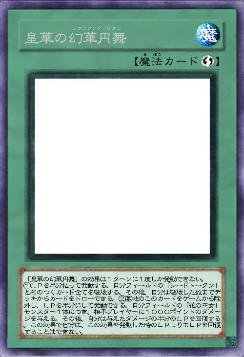 | 「皇華の幻華円舞」の効果は1ターンに1度しか発動できない。 ①LPを半分払って発動する。自分フィールドの「シードトークン」と名のつくカード全てを破壊する。その後、自分は破壊した数までデッキからカードをドローできる。②墓地のこのカードをゲームから除外し、LPを半分にして発動できる。自分フィールドの「花の巫女」モンスター1体につき、相手プレイヤーに1000ポイントのダメージを与える。その後、自分は与えたダメージの半分のLPを回復する。この効果で自分は、この効果を発動した時のLPよりもLPを回復することはできない。 | |||