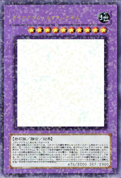 | 「ガイアグラム」同名モンスター×3 ①:融合召喚されたこのカードは、このカードの融合素材となったモンスターと同名カードとして扱う。②:このカードが融合召喚に成功した時に発動できる。自分のエクストラデッキから、表側表示の「ガイアグラム」モンスター1体を守備表示で特殊召喚する。この効果で特殊召喚したモンスターの効果は無効化される。③:このカードの攻撃力・守備力は、このカード以外の自分フィールドに存在するこのカードの融合素材となったモンスターと同名モンスターの数×500アップする。④:1ターンに1度、このカード以外の自分フィールドのこのカードの融合素材となったモンスターと同名モンスター1体をリリースし、相手フィールドのモンスター1体を対象として発動できる。そのモンスターのコントロールを得る。 | |||