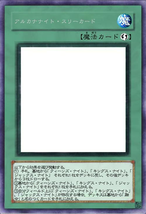 | 以下から効果を選び発動する。 ① 手札、墓地から「クィーンズ・ナイト」、「キングス・ナイト」、「ジャックス・ナイト」 それぞれ1枚をデッキに戻し、その後デッキから3枚ドローする。 ②墓地から「クィーンズ・ナイト」、「キングス・ナイト」、「ジャックス・ナイト」をそれぞれ1枚を手札に加える。 ③自分フィールド上に「クィーンズ・ナイト」、「キングス・ナイト」、「ジャックス・ナイト」が存在する場合、デッキ又は墓地から「融合」と名のつくカードを手札に加える。 | |||