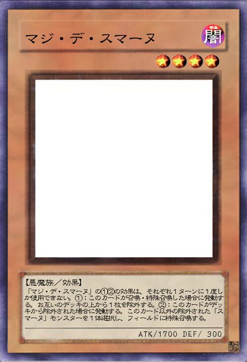 | 「マジ・デ・スマーヌ」の①②の効果は、それぞれ1ターンに1度しか使用できない。①:このカードが召喚・特殊召喚した場合に発動する。お互いのデッキの上から1枚を除外する。②:このカードがデッキから除外された場合に発動する。このカード以外の除外された「スマーヌ」モンスターを1体選択し、フィールドに特殊召喚する。 | |||