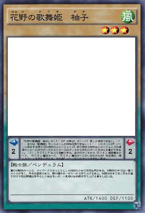 | 「花野の歌舞姫 柚子」の(3)のP効果は1ターンに1度しか使用できない。(1):自分は「歌舞姫」モンスターしか特殊召喚できない(2):このカードがPゾーンに存在する限り次の相手のメインフェイズ1終了時まで相手はドローフェイズの通常のドロー以外でデッキからドロー又はデッキから手札にカードを加える事ができない。(3):800LP払って発動できる。自分のデッキから「RUM」通常魔法カード、「XCM」魔法カード、「RDM」魔法カードのいずれかの内1枚を選び、選んだカードを手札に加える。その後Pゾーンのこのカードを手札に戻す。 | |||